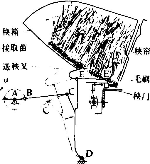 图3 对准式送秧器 整体推送式送秧器 送秧齿板装在秧箱底部连同秧箱一起移动。当移箱至两端极限位置,即最前面 一排秧苗被取完时,由与移箱器联动的机构驱动送秧齿板转动 一个角度,推送秧苗至秧门前端挡板处。调节送秧齿板的转角大小可以获得所需的送秧量。适用于带土苗机动插秧机。 对人力拔取苗插秧机亦可通过增加秧箱倾角或加压秧板等重物实现整体推送秧苗。 送秧机构seedling feeder水稻插秧机上用于向秧门输送秧苗,使之经常有足够秧苗供分插器分取的机构。送秧包括纵向和横向两个方向。纵向送秧使秧箱内的秧苗沿前后方向往秧门补充,有重力式、对准推送式、整体推送式和托送式;横向送秧靠沿左右方向移动秧箱来补充秧苗,又称移箱机构,有拨齿齿条式、转盘齿条式和圆柱凸轮式多种。 |
