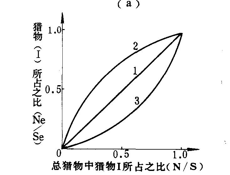 即用猎物类型Ⅰ在食物中所占的比例(Ne/Se) 与猎物类型Ⅰ在总猎物中所占的比例(N/S)制图 (图b)。从图中看出: 除无选择时选择系数呈一常数,图形呈直线 (直线1) 外,其余呈曲线型。当选择系数呈正选择时,即捕食者对猎物类型Ⅰ有选择(曲线2),当选择系数呈负选择时,即捕食者对猎物类型Ⅱ有选择(曲线3)。 |
