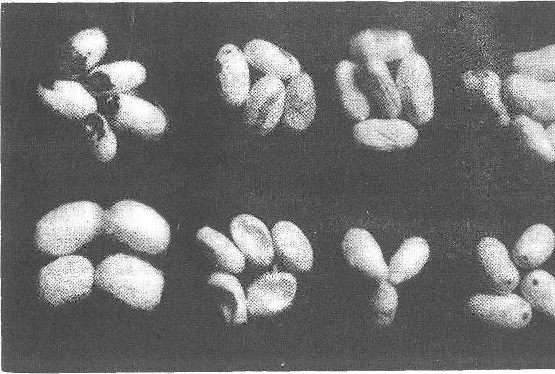 薄皮茧 茧层极薄,茧层重量不到同样号平均茧层重量的1/3。 软绵茧,蚕吐丝结茧中,遇到高温干燥,茧丝间胶着力弱小,茧层松浮,缩皱模糊,手触软绵感。 畸形茧 茧形特畸多角或严重的尖头茧。 油污茧 茧油污的总面积超过0.2平方厘米,或油污较淡但总面积超过0.5平方厘米。 穿头茧 蚕茧被多化性蝇蛆钻出茧层呈一小孔,或被蚕茧害虫咬穿。 薄头茧 茧层头部薄,光线反射暗淡。 压瘪茧 茧层一侧压瘪或沾有污物或蛹油;或二侧压瘪。 霉茧 茧层表面霉变,总面积超过0.5平方厘米。 特小茧 粒茧重量不到同样号平均粒茧重量1/3。 以上13项茧均为下茧标准,凡有疵点但程度不到下茧标准的茧,均作为次茧。 在选茧中有时为了立缫在定粒条件下,遇到生丝纤度在规定范围稍靠粗时可适当筛去少量大型茧,反之如稍靠细时可适当筛去少量小型茧,使其符合生丝目的纤度要求。分型时一般采用筛茧机,有滚筒式和平面式2种,筛茧隔距范围,根据茧型大小可分为16、18、20毫米等数种,当筛笼旋转或往返运转时,可分别筛出小型茧或大型茧。 选茧按工艺要求对原料茧进行分类选别的工序。依缫丝的规格质量要求,一般按茧形大小、茧层厚薄和茧的色泽等进行选别。 选茧cocoon sorting根据制丝工艺要求,对原料茧进行选别分类的工艺过程。一般把茧分为上、次、下3类。上茧:茧形正常,茧色洁白,茧层厚薄均匀,无明显疵点,可缫制优质生丝的茧。次茧:有疵点,但程度不到下茧标准,可以缫次等丝的茧,如轻柴印、轻黄斑、轻油印、轻畸形、硬薄皮、硬绵、轻内印、有色茧等。下茧:又称下脚茧。不能或很难缫丝的茧,如穿头、双宫(可缫制双宫丝)、柴印、黄斑、油印、内印、薄皮、畸形、烂茧、软绵茧等。 |