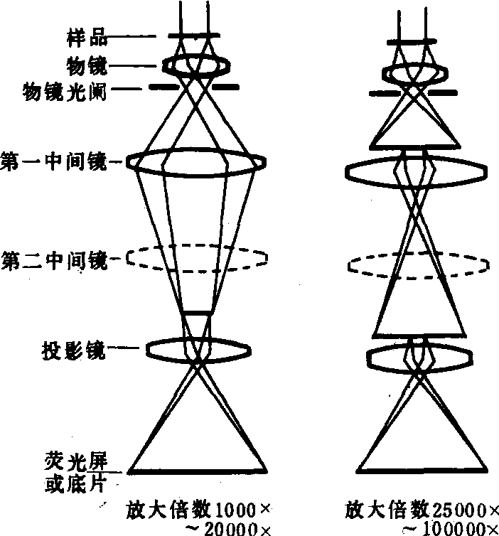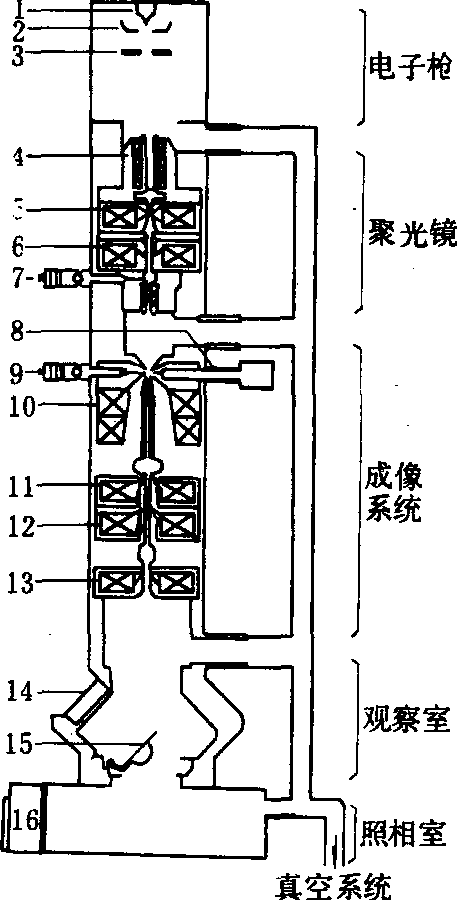 电子透镜系统 即镜筒,是电镜的主体,起着成像与放大作用。由照明、成像及观察记录装置组成。 照明装置 由电子枪和聚光镜组成,产生足够强的、高度稳定的照明电子束。电子枪位于镜筒的顶部,由阴极、栅极和阳极组成。阴极(灯丝)通电加热时,产生热电子发射,形成照明电子束。阳极处于零电位,与阴极的负电位形成一电位差,称为加速电压(一般为50~100kV)。阴极发射的电子束在加速电压作用下得到加速。栅极位于阴极和阳极之间,是一个中央有小孔的圆筒,它相对于阴极-100~-500V,起着控制电子发射及改变电子枪电场分布的作用。电子枪是一个静电透镜,阴极发射的电子束在静电场作用下,会聚在阳极孔附近,形成一直径约30μm的交叉点,这是电镜中的虚光源。聚光镜一般由两个电磁透镜组成,将来自电子枪的电子束会聚在标本上,并根据标本照明需要,控制照明电子束斑的大小、电流密度及孔径角。此外,为提高照明质量和控制照明孔径角,还设有聚光镜光阑和消像散器。在电子枪正下方还有电子倾斜和平移线圈,使照明电子束与聚光镜、成像透镜合轴。 成像装置 由样品室、物镜、中间镜及投影镜等组成。标本被电子束照射后,电子束穿过标本,经物镜形成一级放大像,再经中间镜及投影镜作二级及三级放大,成像于观察荧光屏或感光胶片上。图像最终放大率等于物镜、中间镜及投影镜放大率的乘积(图2)。