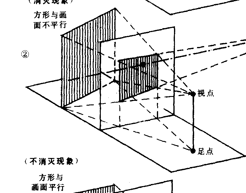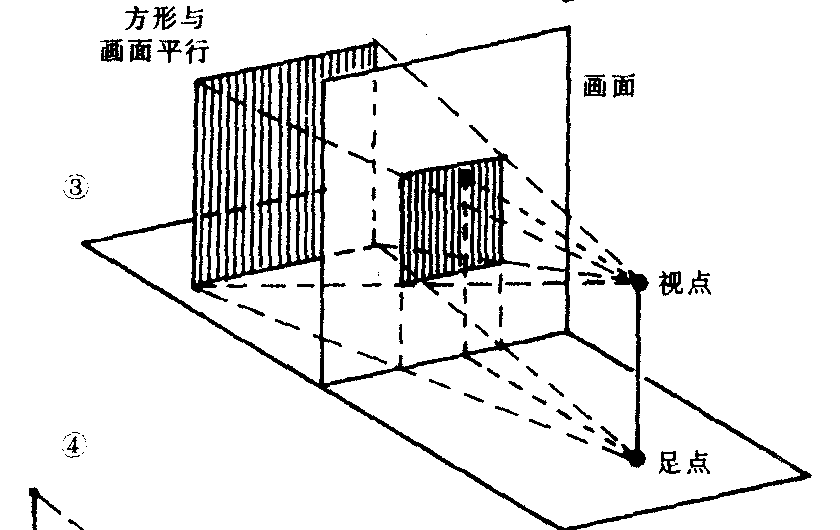 眼睛视物,视线与物体各点相连,它们透过假设画面的各点所连接而成的图形(见图2❷❸)。