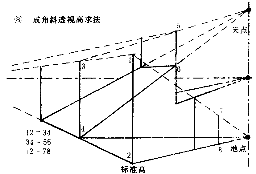 ❼求与画面不平行的上坡或下坡上的透视高度,确定标准高度,把斜坡线延长,求得天点或地点。再由标准高度的上下端连天点或地点,消灭线范围内的垂直线便是透视高。
