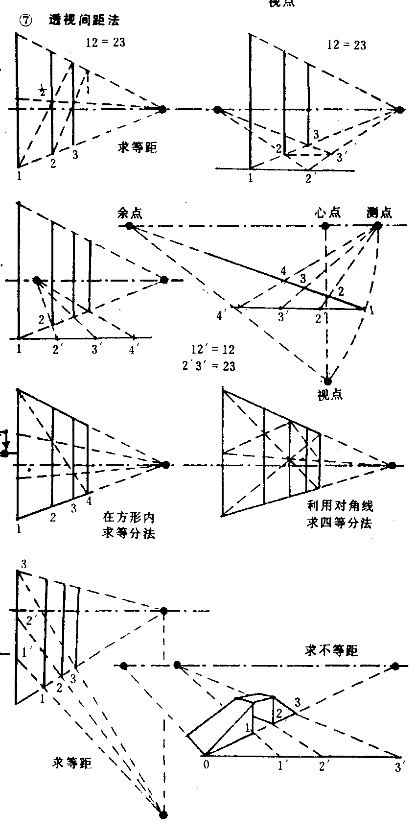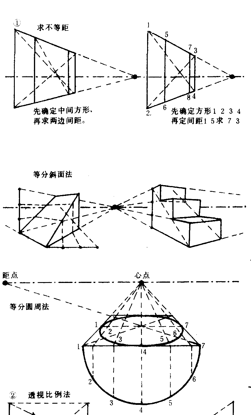 可分等间距和不等间距两种。作法:❶先确定所需的间距,在远边确定1/2点,由近处边底端画线通过远边1/2点连至消灭线得交点,再由此点引垂直线便得第二间距。