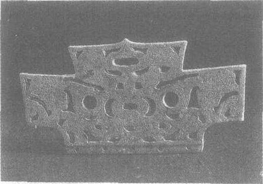 | 释义 | 透雕玉冠状饰铜石并用时代良渚文化。高5.2厘米,宽10.4厘米,厚0.3厘米。1986年浙江省余杭反山良渚墓地第16号墓出土。黄玉所制。以透雕和阴线细刻相结合的手法琢出两面相同的图像。中部为兽面纹,透雕一对圆眼、宽鼻、阔嘴、一对獠牙。两侧各透雕一神人像。像为侧面形象,头戴羽冠,四肢张开,上肢上举,下肢呈下蹲形,露鸟足。玉饰下侧有短榫,短榫上有五个等距小孔。第15号墓也出土了玉冠状饰,只是神人图像是正面的。浙江省余杭瑶山良渚文化墓葬中亦有玉冠状饰出土。良渚文化见“方柱形玉尖状器”条目。