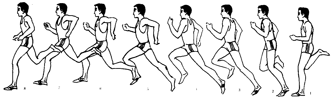 疾跑后到终点冲刺的技术过程。它是全程中距离最长、对成绩影响最大的跑段。其任务是继续发挥和保持高速度。动作要领:❶腿摆动至最高点时,大腿积极下压,膝关节放松,小腿顺惯性前伸,接着前脚掌在身体重心投影点前约30厘米处迅速而有弹性地扒地。当身体重心移过支撑点垂直面时,迅速后蹬,并依次伸展髋、膝、踝关节。后蹬角度约50°。