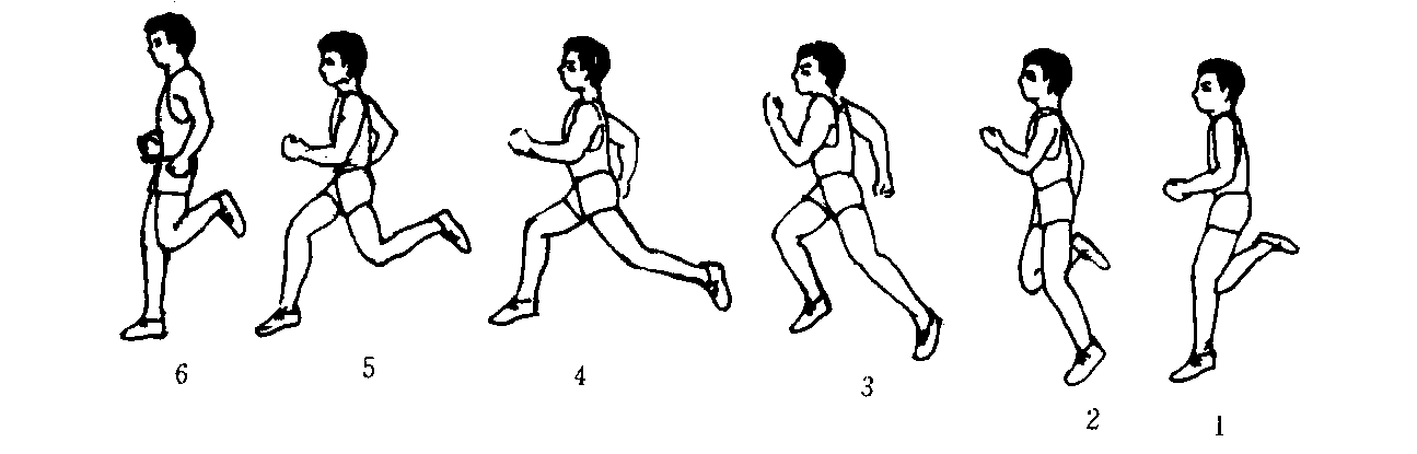 ❺着地后稍屈髋、膝、踝关节缓冲,身体重心前移,准备跑下一步。