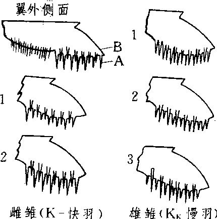 雏鸡出壳时的羽毛性别鉴定 翼外侧面:A为主翼羽 B为覆主翼羽 雌雏:1.出壳时所有羽毛都短,B延伸长度仅及A的1/2~3/4 2.几小时后,羽毛增长,但B仍仅及A的1/2~3/4 雄雏:1.B与A延伸长度相同 2.B稍长于A 3.B比A长得多 |