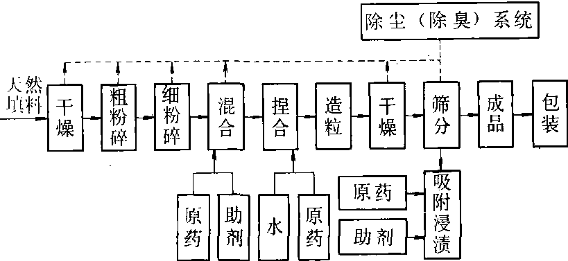 图1 包衣造粒工艺流程示意图 (据郭武棣) 挤出成型造粒法 用挤压机械把原药、助剂及载体的混合物通过孔隙,挤成颗粒的造粒方法。先将原药制成原粉,然后以原粉(或母粉、液体原药)、辅助剂及水,与载体按一定比例加入捏合机中,充分混匀后,送进造粒机。造出的颗粒经预干燥、沸腾干燥、筛分,进入包装系统。(图2)