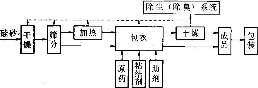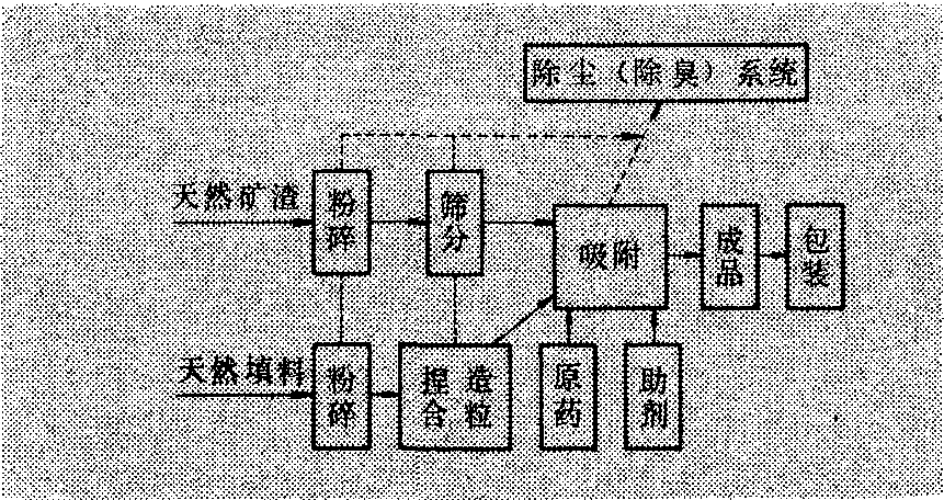 吸附造粒法 把液体原药(或固体原药溶液)及助剂,采取浸渍或喷雾方式,使之吸附在粒状载体上的造粒法。载体可以是易解体的,或不解体的。易解体的载体一般先将粉状载体经捏合造粒,然后再吸附上原药及助剂; 不解体的可用矿石、工业废渣或煤渣为原料,经粉碎、筛分,得到一定粒度范围的颗粒载体,然后再使载体颗粒吸附原药及助剂。(图3)