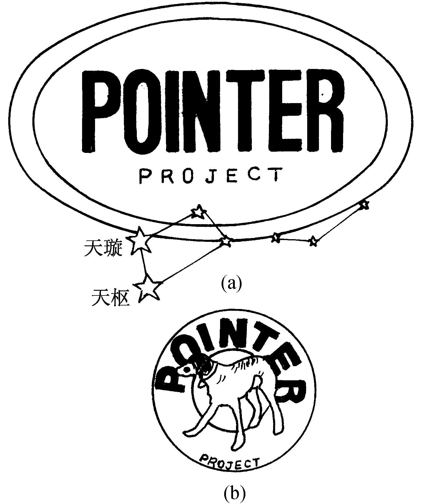 道路交通位置与方向信息的指北图案 由指北图案,注明编号的路线图,路线里程与该地附近公路网络所构成,竖立于主要交叉路的标示牌。目的是使驾驶员明确所在位置,为到目的地应行驶的路线方向与距离。图(a)为指北图案,用北斗七星表示,连接天璇与天枢两星连线方向,延长约五倍处就找到北极星,即正北方向。图(b)是用猎犬寻找猎物图形,其眼睛正望向正北,有艺术气息。 |