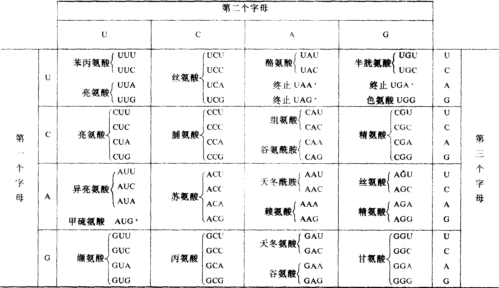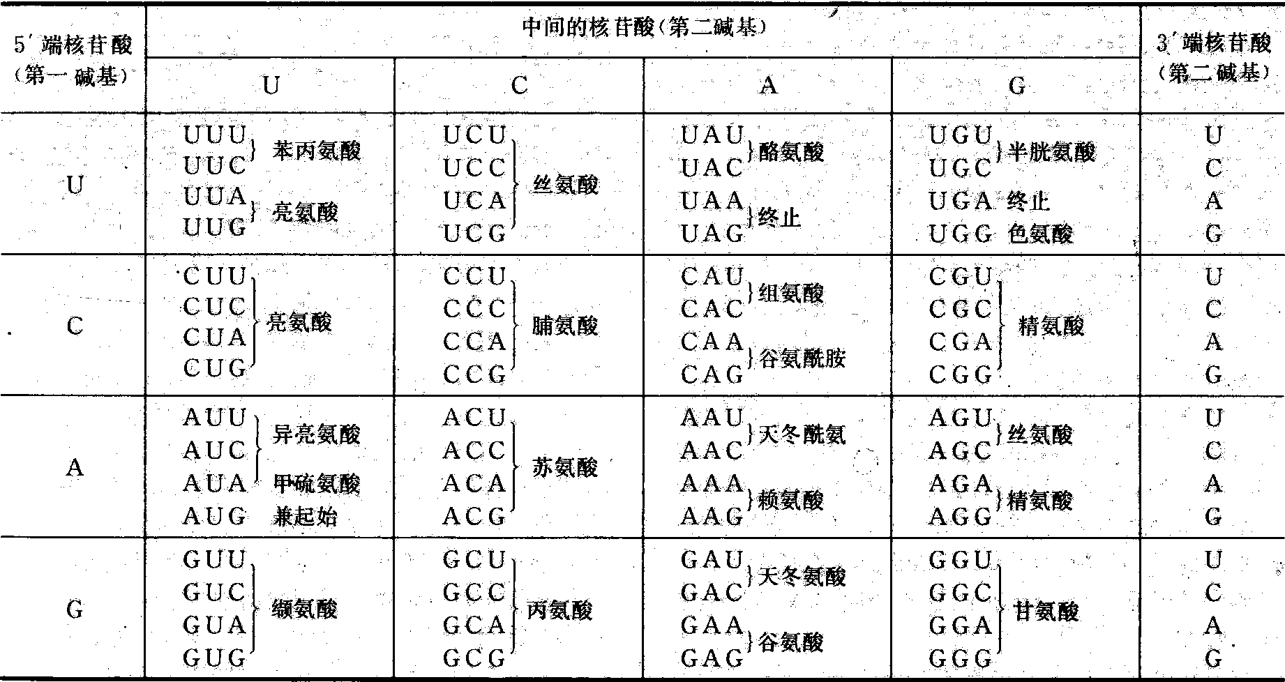 1961年美国学者尼伦伯格 (M. W. Nirenberg)等以人工合成的mRNA作模板,进行蛋白质的离体合成,随后再测定产生的多肽的氨基酸顺序。发现多聚U作为信使则合成多聚苯丙氨酸,多聚A作为信使则合成多聚赖氨酸; 多聚C产生多聚脯氨酸; 多聚G产生多聚甘氨酸等。说明苯丙氨酸、赖氨酸、脯氨酸、甘氨酸等的密码子分别是UUU、AAA、CCC、GGG等。美国学者柯拉纳(H.G.Khorana)用共聚的多核苷酸UGUGUGUG……作为信使则合成缬氨酸与半胱氨酸多聚体。以后确证缬氨酸的密码子是GUG,半胱氨酸的密码子是UGU。1964年开始,尼伦伯格等进而用64种人工合成的三核苷酸和氨基酸-tRNA(即与tRNA结合的活化氨基酸)、核糖体三者进行结合试验,证明各种三核苷酸具备信使作用。例如三核苷酸是UUU时只与苯丙氨酰-tRNA结合;AAA只与赖氨酰-tRNA结合,而二核苷酸无此作用。用这一方法最终揭示了64种密码子中61种密码子与20种氨基酸之间的对应关系,于1966年完成遗传密码表(表2)。5′端核苷酸、中间核苷酸,3′端核苷酸(或称第一碱基、第二碱基、第三碱基)依次组成一个密码子,此称三联体密码。表2中所列64个密码子中有61个编码18种氨基酸和2种酰胺。其他如胱氨酸、羟脯氨酸、羟赖氨酸等是在肽链合成后再行加工而成。还有3个不编码任何氨基酸只作为终止信号的密码子。密码子AUG既编码甲硫氨酸又有合成起始点的作用。 表2 遗传密码表