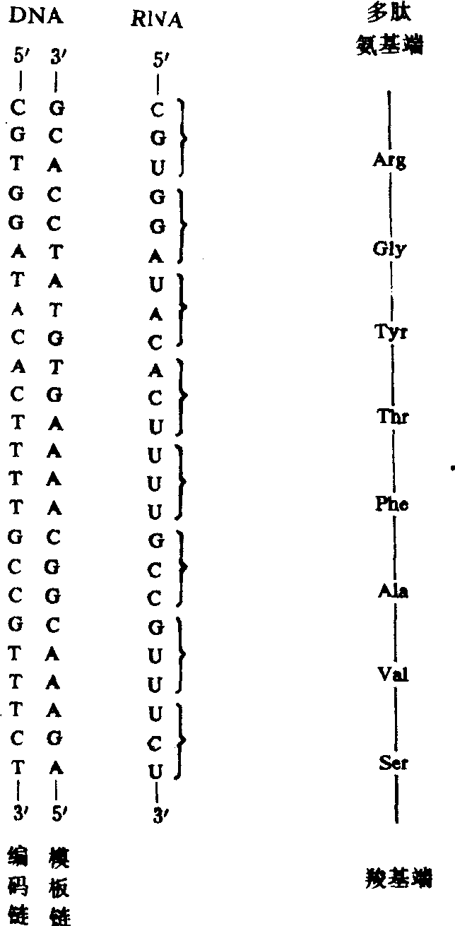 图585 DNA、mRNA与蛋白质的对应关系 尼伦伯格因发现遗传密码与合成遗传密码的柯拉纳(H.G.Khorana)同获1968年度的生理学或医学诺贝尔奖。由于自1979年以来,已先后在人、牛、酵母和链孢霉等的线粒体及枝原体、腺病毒和包括草履虫等3种原生动物中发现了变异密码子的存在,变异密码子的数目多达10个以上,有人认为:生物界可能存在另一张密码表。遗传密码genetic code信使核糖核酸(mRNA)中决定蛋白质的氨基酸排列的核苷酸三联体顺序。脱氧核糖核酸(DNA)分子上的遗传信息由腺嘌呤(A)、胸腺嘧啶(T)、鸟嘌呤(G)、胞嘧啶(C)四种核苷酸组成。mRNA的遗传信息从DNA双链中一条单链(编码链)转录而来,每三个核苷酸构成一个密码子。转运核糖核酸 (tRNA) 分子中有三个与mRNA的三联体密码互补配对的核苷酸称反密码子。每种tRNA具有特定的反密码子,因此蛋白质合成时每种tRNA携带一种特定的氨基酸到mRNA链上“对号入座”,即按mRNA上核苷酸顺序决定氨基酸顺序,也就是决定蛋白质种类,故DNA是通过mRNA指导蛋白质合成的。