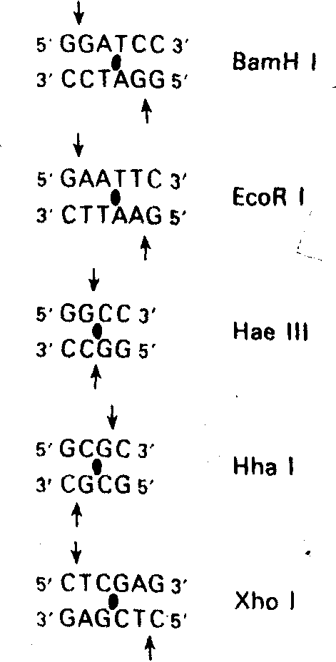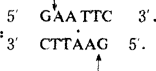 个核苷酸,是具有2次旋转对称的片段。就是说,将写有这个序列的纸平面围绕一个中心点旋转180°后,仍得到完全相同的序列。限制性核酸内切酶对底物序列的切点有的是平齐的,有的是交错的。在后一种情况下产生能够互相配对的“粘性末端”。例如,一种来源于大肠杆菌的限制性核酸内切酶EcoRI(每个酶都有一个符号)识别的序列为