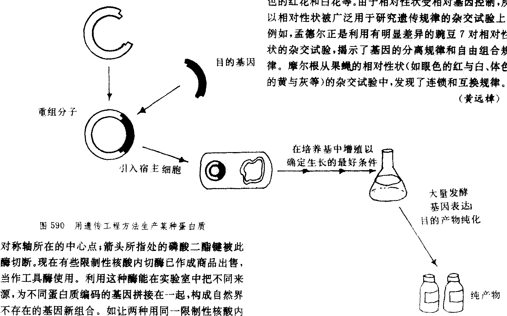 对称轴所在的中心点,箭头所指处的磷酸二酯键被此酶切断.现在有些限制性核酸内切酶己恰逢成商品出售,当作工具酶使用.利用这种酶能在实验室中把不同来源,为不同蛋白质编码的基因拼接在一起,构成自然界不存在的基因新组合.如让两种有同一限制性核酸内切酶切割的DNA混合、共热并缓慢冷却,它们的粘性末端就会互相配对产生非共价联合的新重组DNA。如再用DNA连接酶和必要的能源处理,将产生共价连合的新重组DNA。将无关基因的新组合引入合适的细胞,可通过宿主细胞的DNA合成机器扩增许多倍。基因工程就是一种基因重组和扩增技术。医药工业首先广泛应用基因工程方法使极难获得的药用蛋白质得以进行商品规模的生产。如1982年英、美、西德等国家已利用细菌生产人的胰岛素。已用遗传工程方法生产的产品尚有:人生长激素、几种类型的干扰素、抗口蹄疫疫苗等。由于可定向改良生物品种,遗传工程技术也广泛用于农业。如1986年日本成功地将油菜的抗病基因移到卷心菜上,培育出了蔬菜的新品种;比利时科学家把一种昆虫的毒素基因移植到烟草细胞中,使其生长成植株后有很强的抗御能力;美国已能够把仙人掌基因移入小麦、玉米或大豆,培育耐早的豆类等作物。美国、日本和西欧等国许多专家运用遗传工程等技术,力图把豆科植物根瘤菌的固氮基因移植到稻、麦、玉米等作物的植株上,使它们具有固氮能力。一旦成功,作物将自行造肥。我国科学家开展基因工程研究也已获得一些成果。如人甲型干扰素已研制成功;人生长激素的研制已突破了实验室研究水平;又成功地将黄瓜花叶病毒基因转入西红柿中,首次得到具有抗病毒遗传特性的新株系。 遗传工程广义指细胞水平上的遗传操作(细胞工程)和分子水平上的遗传操作(基因工程);狭义专指基因工程。 遗传工程genetic engineering用人工手段在不同结构水平上改造生物遗传性的技术。包括个体水平(杂交育种)、细胞水平(体细胞融合、核移植)、细胞器水平、染色体水平(倍性育种、非整倍体育种)、基因水平以及分子水平(DNA重组技术)上的遗传操纵。但习惯上专指基因工程。以分子遗传学理论为基础,综合运用生物学中有关学科的现代方法与手段,于20世纪70年代发展起来的一门新技术。可以绕过生物间的生殖隔离,利用外科手术式的无性操作,使遗传物质在微生物、动植物乃至人类各大系统间进行交流;可以预先对遗传操纵规定施工“蓝图”;定向引起生物变异,加速新品种育成过程(见“基因工程”)。 遗传工程Genetic Engineering改变细胞或生物体染色体组合成分的技术。广义的遗传工程包括人为地选择、创造动植物品种。20世纪70年代中期,“遗传工程”一词开始出现,原指对亲缘关系很远的物种基因移植。不同品种之间的杂交培养出许多农作物新品种。现代遗传工程主要采用以下五种技术:无性繁殖,用一个单细胞培育出遗传基因完全相同的一组细胞或个体,所有的微生物、许多植物和一些多细胞动物常以无性的方式繁殖;分子融合,将两种动物或植物的细胞和细胞核融合,培育出杂交细胞;细胞核移植,用微型外科手术将细胞核从一物种取出,再植入另一物种的细胞内;基因无性繁殖,将某一生物的脱氧核糖核酸的一部分同另一脱氧核糖核酸分子在试管中结合,培养出重组的脱氧核糖核酸分子;转换,用细胞吸收重组的脱氧核糖核酸分子。加拿大的遗传工程研究主要在大学实验室、工业部门、联邦及省的研究机构进行。如运用于医学研究的有蒙特利尔的艾耶斯特实验室、多伦多的康诺特医学实验室等;酿造业运用于发酵试验;萨斯喀彻温省大学运用遗传工程技术生产新疫苗预防牲畜传染疾病。 遗传工程生物工程的生要内容之一。它是人们运用分子生物学知识所设计的巧妙方法,定向改造生物遗传特征的一种先进技术。遗传工程也称基因工程,它指的是根据人们的需要,利用精巧的技术,把一种生物的遗传物质(脱氧核糖酸DNA)经过酶的剪切,引入另一种生物细胞内,让它们在那里“安家落户”,产生出人们所需要的物质,培育出新品种,使生物更好地为人类服务。 目前,科学工作者使用的遗传工程方法,是把某种生物细胞中的遗传物质DNA提取出来,这需要借助于一种活的手术刀——有切割作用的限制性内切酶,将DNA按特定位点切成片断。另外,又从细菌细胞质中提取出一种也含有DNA的质粒,也加进切割酶,把质粒切成片断。每一种内切酶所切断的DNA片断,其断头切割面的形状都严格一致,所以当DNA片断与质粒混合时,它们便互相靠拢,再加入具有缝合作用的联结酶,两种片断联在一起,就成为具有某细胞的DNA的质粒了。借质粒的运载作用,可以把某细胞的DNA引导到另一细胞中去,并在后一细胞中繁殖遗传。这样产生的细胞,就具有前一种细胞的遗传信息,从而有目的改变细胞的遗传结构。 遗传工程是70年代后发展起来的一项新技术,在工业、农业和医药领域具有重大的意义。应用遗传工程的方法,可以增加生物体的遗传种类,重新安排和设计生命的程序,定向培育生物良种,育种周期也可大大缩短,例如,要获得一个新的组合性状,用基因重组技术培育新品种,比自然进化过程要快一倍到十亿倍。利用遗传工程技术把哺乳动物的生长抑制激素基因移植到大肠杆菌中去,创造了能产生出抑制激素的大肠杆菌菌株。此外,遗传