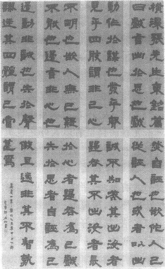 | 释义 | 邓石如隶书录宋张载东铭篇清。纸本。纵166.1厘米,横45.2厘米。四川省博物馆藏。邓石如(清乾隆八年一嘉庆十年,即公元1743—1805年),初名琰,字石如,避嘉庆仁宗帝(顒琰)讳,遂以字行,后改字顽伯,因居皖公山下,又号完白山人、笈游道人。安徽怀宁人。少时居僻乡,好刻石,工仿汉人印篆。由梁𪩩介绍到江宁梅镠家,纵观秦、汉以来金石、善本、书法,在梅氏家八年,专心临摹,寒暑不断,其书艺大成。工篆书,以二李为宗,融合诸体,稍参隶意,独具风格,是乾嘉时期著名的书法篆刻家。清包世臣《艺舟双楫》云:“怀宁篆隶分已臻绝诣,真书虽不入晋,其平实中变化要自不可及。”清杨守敬《学书迩言》云:“顽伯以柔毫作篆,博大精深,包慎伯推为直接二李,非过誉也。”清康有为《广艺舟双楫》云:“怀宁集篆之大成,其隶楷专法六朝之碑,古茂浑朴,实与汀州分隶之治而启碑法之门。”近人马宗霍《霋岳楼笔谈》云:“完白以隶笔作篆,故篆势方,以篆意入分,故分势圆。两者皆得之冥悟。而实与古合。然卒不能侪于古者,以胸中少古人数卷书耳。”著有《完白山人篆刻偶存》。《清史稿》卷五百三有传。此隶书八条屏书宋张载《东铭篇》,每幅两行,行八字,第八幅第二行为两字,下款署:“嘉庆十年岁次乙丑春中月,下瀚后学邓石如书。”款下钤白文<邓氏完白>、朱文<石如>两印。所写隶书渗入有篆法,用笔以中锋见长,圆润遒劲,结体方正工整,笔画沉雄平实,通篇布局纵有行,横有列,有上下取势,左右呼应,平和简静,遒丽天成。