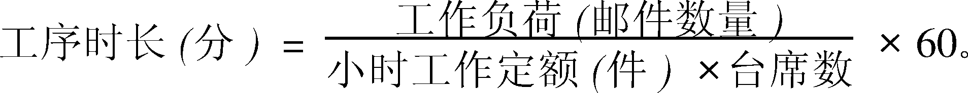 在邮政生产过程中,邮件在某一工序处理所需要的时间。组成邮件处理总时长的基本单元。例如对信函为由粗分台席接收之后分拣完毕再将信函全部移交细分台席为止的全部时间。计算工序时长的公式为: