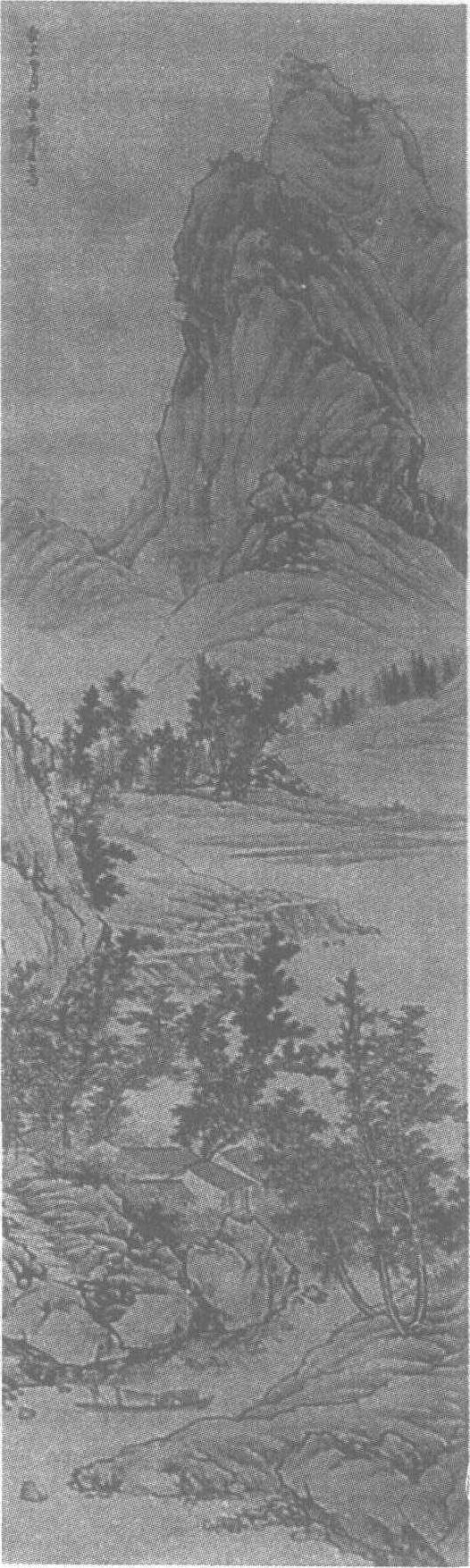| 释义 | 邹喆山村秋色图轴清。邹喆(见《邹喆松林僧话图轴》条目)绘。绢本浅绛。纵159厘米,横51.5厘米。北京首都博物馆藏。作者以平远法构图,绘屏立山峰之下的景色。山麓处林木蓊茸,溪水缓缓流由山间出,茂树间座落村舍掩映,有的房屋隐于巨大的奇石之后,村旁的石阶可下至水边,河面上渔人悠闲地摇橹。作者画峰峦、巨石时使用了小斧劈皴和长披麻皴,山势巉绝,巨石雄奇,树叶点墨细腻,用笔娴熟而变化多端,创作出天高云淡,清秋薄暮的乡野风光。