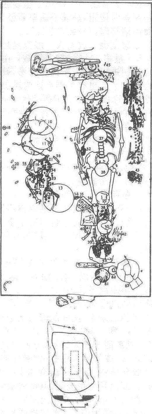 (1.2.33短剑、3.双钮镜、4.簪5.19.绞具、6—9喇叭形器、10—16圆形饰、17. 圆环、18.25. 马头泡饰、19. (原缺)、20管、22. 镶衔、23.珠、24.节约、26—31镜形饰,32.七连环34斧35凿、36斧囊37. 刀囊饰牌38. 靴上大泡、39. 靴上小泡、40.锥41.刀42.Ⅰ式镞43.Ⅱ式镞、44.弓囊上泡饰45.销、46.大石串珠、47小石串珠48—50剑把上石饰、51.石佩珠52—53.弓囊和弓弭54—56.骨鏕57.骨簪、58. 牛骨、59—60板灰、61—63 陶壶、64. 骨针) |