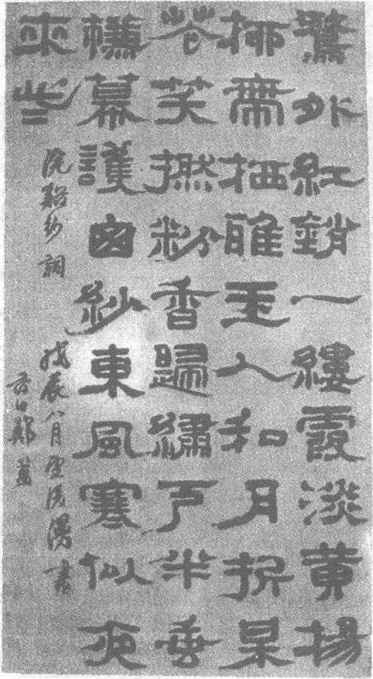 | 释义 | 郑簠隶书浣溪沙词轴清。纸本。纵173.6厘米,横89.6厘米。上海博物馆藏。郑簠(明天启二年—清康熙三十一年,即公元1622—1693年),字汝器,号谷口,上元(今江苏南京)人,以行医为业,终生不仕。善刻印,工书,少时便矢志习隶书,于《史晨碑》、《曹全碑》临摹甚勤,曾不遗余力购求天下汉碑,家藏积有四厨,并沉酣于汉碑达30余年。他倡学汉碑,对后来汉隶之学的复兴颇具影响。他自称:“作字最不可轻易,笔管到手,如控千钧弩,少弛则败矣。”其学生张在辛对郑簠书评价云:“作字正襟危坐,肃然以恭,执笔在手,不敢轻下,下必迟迟,敬慎为之。”清方朔《枕经堂题跋》曹全碑跋:“国初郑谷口山人专精此体,足以名家,当其移步换行,觉古趣可挹。至于联扁大书,则又笔墨俱化为烟云矣。”近人马宗霍《霋岳楼笔谈》云:“谷口分隶,在当时殊有重名,以汉石律之,知其未入古也。然笔较唐分则稍纵,故尚不伤雅。”此《浣溪沙》词:“鹭外红销一缕霞,淡黄杨柳带栖睢,玉人和月折杲花。笑捻粉香归户,半垂帘幕护窗纱,东风寒似夜来些。”下有款署“浣溪沙词”、“戊辰八月”。“戊辰”即公元1688年,时郑氏66岁。此隶书法从《曹全碑》、《史晨碑》,并融有篆意,字体宽博,以横画取势,用笔爽捷而净简,行笔泼辣,放则纵肆,守则凝厚,奇正参差,巧拙互补,苍迈伟阔。章法排列紧密,书味洋溢,情趣盎然,于婉丽媚巧中有高雅之气。