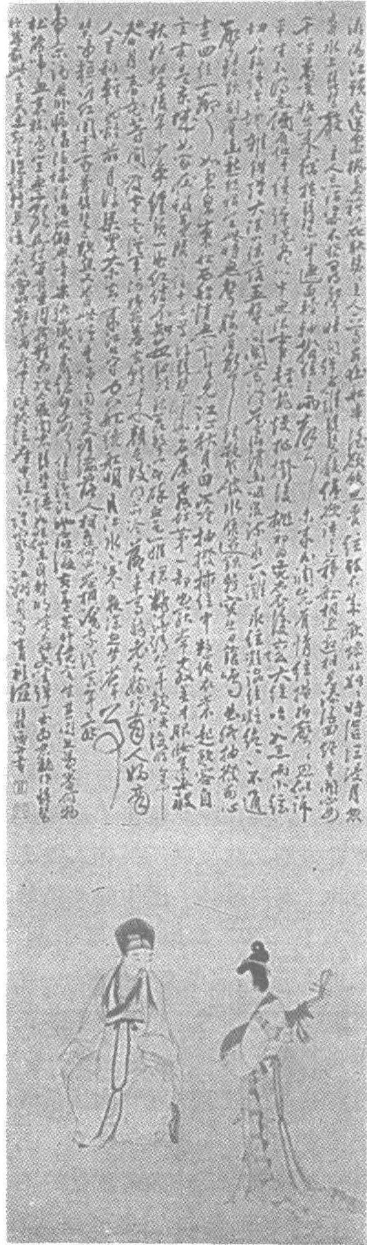 | 释义 | 郭诩琵琶行图轴明。郭诩(见《郭诩东山携妓图轴》条目)绘。纸本墨笔。纵154厘米,横46.6厘米。北京故宫博物院藏。《琵琶行》是唐代大诗人白居易的长诗。诗人在唐宪宗元和十一年(公元819年)间因直谏被贬为江州(今江西九江)司马,次年作《琵琶行》,通过描写沦落江湖的歌女的不幸遭遇来抒发自己的愤懑心情。此图郭诩根据诗意而作,描绘的是诗人白居易与歌女邂逅的情形。歌女怀抱琵琶,头绾高髻,身穿拖地长裙,体态丰腴,容貌秀美,面向诗人垂目而立,神情忧郁,似乎在向诗人诉说自己的不幸境遇。诗人正襟端坐于旁,双手抚膝,温文持重,神情肃然,似乎正在倾听歌女的诉说,并且有所感悟。人物刻画得细致入微,形神兼备,与诗中“同是天涯沦落人,相逢何必曾相识”这一主旨相吻合。此图不设背景,上方是画家自书的行草《琵琶行》全诗,幅面占全图的2/3。署款“清狂画并书”,下钤〈仁弘〉等印二方。
