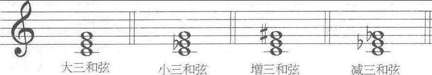 三和弦根据其音程结构的不同分为四种:(1)大三和弦:根音到三音是大三度,根音到五音是纯五度,三音到五音是小三度;(2)小三和弦: 根音到三音是小三度,根音到五音是纯五度,三音到五音是大三度;(3)增三和弦: 根音到三音是大三度,根音到五音是增五度,三音到五音是大三度;(4)减三和弦: 根音到三音是小三度,根音到五音是减五度,三音到五音是小三度。 例: 四种三和弦
