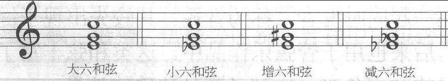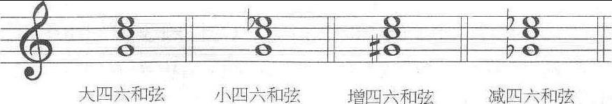 以三和弦的根音为低音的三和弦,称原位三和弦。以和弦的三音或五音为低音的三和弦,称转位和弦。以三音为低音是三和弦的第一转位,称六和弦,用“6”标记,其特征是三音与根音构成六度关系(原来根音与三音的三度关系的转位; 以五音为低音是三和弦的第二转位,称四六和弦,用:64标记,其特征是五音与根音构成四度关系(原来根音与五音的五度关系的转位),五音与三音构成六度关系(原来三音与五音的三度关系的转位)。 例: 三和弦的第一转位
