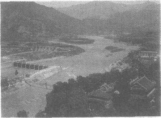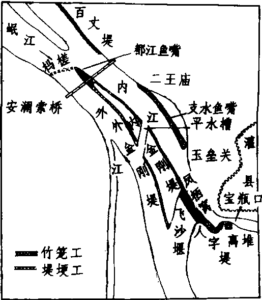 都江堰渠首工程图 都江堰中国最悠久的著名大型水利工程,国家级风景区。在都江堰市城西1千米玉垒山下岷江干流上。岷江发源于阿坝州的岷山弓杠岭,每年洪水季节,江水横溢。为治理水患,古蜀王杜宇曾派丞相 “块玉垒以除水害”。秦昭王时期 (前3世纪中叶),蜀郡太守李冰吸取前人治水经验,确定“引水以灌田,分洪以灭灾” 的方针,兴建水利工程,当时俗称都安大堰、湔堰和金堤,唐朝时称犍尾堰,宋以后称都江堰。建成后,使成都平原形成自流灌溉,“沃野千里”,“水旱从人”,“不知饥馑,时无荒年”,“天府之国” 由此得名。都江堰引水工程,包括堰渠主体工程和灌区两大部分,主体工程主要由鱼嘴、飞沙堰、宝瓶口三项工程组成,另外还有百丈堤、杩脚沱护岸、内外金刚堰、二王庙顺堤、人字堤等附属工程,鱼嘴修筑在岷江的江心,顶端形如鱼嘴,将岷江分为内江和外江,内江用于灌溉,外江用于排洪。飞沙堰是修建在分水堤坝中段的泄洪道,洪水期不仅排泄洪水,而且利用特殊的水流动力,把流入江中的大部分沙石排入外江。宝瓶口,高13米,长80米,宽43米,是玉垒山被凿开的内江进水口,状似瓶颈,无论洪水多大,都只能将一部分引入内江,起到控制洪水的作用。玉垒山被凿离的大石岩,称为离堆。形成完整的排洪、泄沙、引水工程体系。现代修建有外江闸、沙黑河闸、工业取水口等引水工程设施。灌区分布于成都平原和龙泉山脉以东丘陵地区。几千年来尤其是中华人民共和国成立后,四川人民对都江堰进行了多次大规模的改造利用,不断维修完善,加强管理,充分发挥了其在防洪、农业灌溉、工业用水、旅游观光等多方面的综合效益。 都江堰战国时期秦国蜀郡守李冰在成都附近岷江中游修建的综合性防洪灌溉工程。岷江上游水源旺盛,自山区转入成都平原后,流冻陡,易淤易决,常有灾害。战国时,蜀郡守李冰在前人治水的基础上访察水脉,因地制宜,因势利导,基本上完成了都江堰的排、灌水利工程。此后历代都有扩建,不断发展完善。主要设施是:在岷江江心,以竹笼卵石堆砌成鱼嘴状的分水工程,下接金钢堤,使岷江在此分为外江及内江两股。外江原系岷江正流,在下游辟有许多渠道,兼具排洪作用; 内江在都江堰市西南经凿玉垒山成宝瓶口,向下辟为走马河、蒲阳河、柏条河等支流穿入成都平原,成为灌溉兼航运的渠道。都江堰内外两江及渠道灌溉总面积规已扩大到800多万亩。 都江堰四川省都江堰市境内,引岷江水灌溉成都平原的大型水利工程,是现存世界上历史最长的无坝引水水利工程。始建于公元前256~前251年(秦昭王末),秦蜀守李冰主持兴建。采取“分流守江,筑堰引水”的方法修建。都江堰由“分水鱼嘴”、“飞沙堰溢洪道”、“宝瓶口引水口”等3大工程组成。分水鱼嘴以块石筑成,将岷江水一分为二,外江流入长江,内江为人工渠,江水经宝瓶口流入灌溉区。鱼嘴长30~50 m,高8~12 m,建在江心洲顶端,把岷江分为内江和外江。枯水时,分流比为内6外4(内江流量约占60%,外江约占40%),以引水灌溉为主;洪水时,外6内4,以便泄水防洪。飞沙堰是用竹笼装卵石筑成,位于内江右岸,堰高2 m,宽150~200 m,低水位时壅水入宝瓶口,汛期堰顶溢流,特大洪水时允许冲决堰体,增大溢流量。宝瓶口是经劈山开凿而成,是调节内江流量的咽喉。宝瓶口口门宽20 m,高40 m,长80 m,能引水、灌溉、漂木,控制少进洪水,减轻内江灌区洪涝威胁。2000多年来,灌区积累了丰富的引水防沙经验。1949年以后,对都江堰工程进行了较大改建。加固了鱼嘴、飞沙堰和宝瓶口三大工程;在岷江干流上修建了外江闸,全长104.4 m,共分8孔,每孔净宽12 m,当岷江100年一遇洪峰流量7700 m3/s时,泄洪流量可达4130 m3/s;在老灌区修建了50余座重要分水枢纽;改造了3万多条旧渠道;在新灌区修建了10座大中型水库、300余座小型水库,总库容达12亿 m3,都江堰灌溉面积由1949年的19.2万 hm2发展到1999年的67万 hm2以上,是中国目前灌溉面积最大的灌溉工程。 都江堰位于四川省都江堰市(原灌县)西北岷江干流中游。古时因在都安县境内,称为都安堰。晋、北魏时称湔堰、湔堋,唐代称犍尾堰,宋、元以后始称都江堰。岷江自山区进入成都平原,流速陡减,河床易淤,河岸易决,中下游经常发生水灾。秦昭王时,蜀郡守李冰父子在前人治水的基础上,兴建了都江堰,使成都平原“沃野千里,号为陆海”、“水旱从人,不知饥馑,时无荒年”(《华阳国志·蜀志》),成为“天府之国”。工程主要设施在江心,以竹笼装卵石,堆砌成鱼嘴状的分水建筑,下接金刚堤,将岷江分为内江和外江。外江原系岷江正流,在下游辟有许多灌溉渠道,兼具排洪作用;内江在原灌县城西南凿玉垒山成宝瓶口,由此向下辟为走马河、蒲阳河及柏条河等,穿入成都平原,成为灌溉兼航运的渠道。都江堰的溢流工程有飞沙堰、平水槽、人字堤。飞沙堰在金刚堤的下端,堰长约270米。当宝瓶口水位超过一定高度时,束水通过堰顶向外江溢流。人字堤在宝瓶口右侧,上接飞沙堰,下接离堆,当宝瓶口出现更高洪水位时,洪水通过堤顶向外江溢流。都江堰附近的河底常易被沙砾卵石充填淤高,每年必须在外江、内江轮流用杩槎断流,以便进行淘挖。相传李冰制定了“深淘滩,低作堰”的岁修原则和“遇弯截角,逢正抽心”的八字治水方针。都江堰工程历代均进行过维护整修,灌溉面积不断扩大。 都江堰