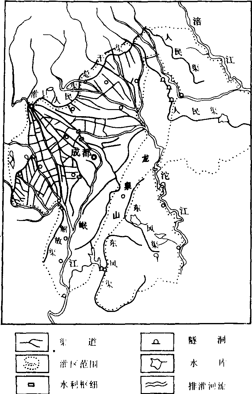 ❸宝瓶口:在内江和飞沙堰之南,是劈开玉垒山坚硬的砾岩而形成的总进水口。这个“口”高约30米,宽约20米,长达100米。源源不断的岷江水从这个口流入到人工开挖的灌溉总渠内。又通过太平鱼嘴进入到走马河、柏条河及蒲阳河等渠道。除了上述工程外,古代人民还在古堰附近兴建了便于掏挖河底沙卵石的建筑设施,即用三根圆木构成三角架,中设平台,上置卵石。在迎水面加横木、竖木,外置竹席,上加培粘土,平时可起挡水作用,不用时极易拆除的“杩槎”断流,以便进行掏挖。在飞沙堰对面河底,还埋有两支铁桩,作为春天掏滩的标准。在宝瓶口设有“水则”,它是古代的水位标尺,可记录进水的总量。都江堰水利工程共筑堤2 000多道,开挖大干渠10条,支渠520多条,渠道总长达1 165公里,灌溉农田300万亩。它的建成大大改变了成都平原的面貌。“旱则引水浸润,雨则杜(堵)塞水门”,从此成都平原成为水田阡陌、渠道纵横的“天府之国”。但是,后来由于长久失修,河床淤塞,堤坝破烂,渠道紊乱,灌区旱涝频繁。近百年来发生了十多次较大洪灾,灌溉面积由300万亩缩减到190万亩。中华人民共和国建立后,对这一古老水利工程进行了大规模整治,如将渠首竹索桥改建为水泥桩钢绳索桥;都江鱼嘴堤堰用水泥卵石混凝土代替了竹笼卵石;加固拓宽了金刚堤、飞沙堰;在走马河、柏条河、蒲阳河和外江上相继修建了现代化的节制闸;在下游灌区内还修筑了人民渠、西河灌区、东风渠等一系列渠道,使灌溉面积扩大到800多万亩。古老的都江堰从此换上了新装。