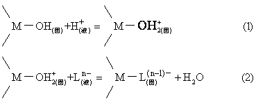 +2)。这样既能吸引带负电荷的含氧阴离子(Ln-),又使羟基成为易被置换的—OH+2基〔(2)式〕。从而完成配位体交换的两步反应。如体系pH≥ZPC时,氧化物表面即呈中性或负电性,会使阴离子不易靠近表面或受到排斥。此时只能依靠阴离子共轭酸的解离而提供的质子,中和表面的负电性或使之带正电荷,完成(1)式所示的第一步反应,并连串地发生(2)式的交换反应。因此,可以认为配位体交换反应是以质子为媒介的。