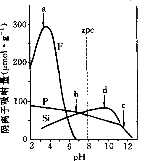 试样为针铁矿,支持电解质为0.1mol/l NaCl。F、P、Si分别表示氟化物、磷酸盐、硅酸盐。a、b、c、d为曲线上的拐点,依此与氟氢酸pKa、磷酸的pK2、pK3以及硅酸的pK相近或一致