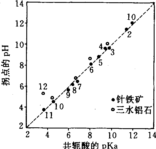 pH作图(图1),则这些曲线上的拐点(包括最高点)所对应的pH值与各相应的共轭酸的解离常数(pKa)值十分接近,清楚地表明体系pH影响吸附的全过程。但pH的重要影响不在改变表面电荷符号和数量,而是影响阴离子共轭酸的解离。图2指出针铁矿和三水铝石对几种含氧阴离子和氟离子的最大吸附量—pH曲线上的拐点pH与相应酸的解离常数的关系。可以