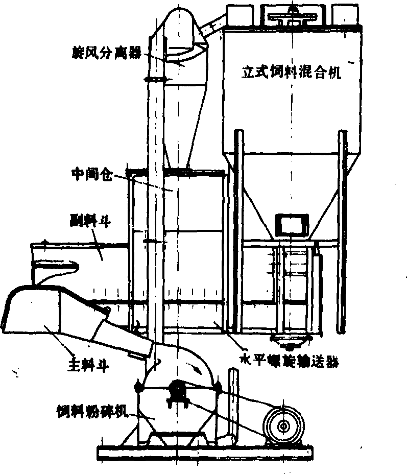 图1 1.0吨/小时级粉料加工机组 代加工的业务,但要求地区有良好的道路路面,服务半径以20千米为宜。固定式机组装在统一的机架上,只能进行固定作业,常用于饲料加工车间或小型配合饲料加工厂。典型结构 中国生产的1.0吨/小时级粉料加工机组结构如图1,适用于3 000头猪或4.5万只鸡。由人工计量,分批作业。谷粒经称量后倒入主料斗,经饲料粉碎机粉碎后由风机吹入旋风分离器,沉降后落入中间仓,副料经称量后从副料仓加入。两仓内饲料由水平螺旋输送器送入立式饲料混合机混合,混合均匀后即卸料,由人工称重装袋。 美国生产的2.5~5吨/小时级全自动粉料加工机组结构如图2。其工艺流程与中国生产的1.0吨/小