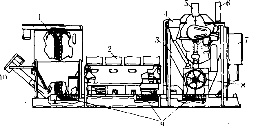 图2 2.5~5吨/小时级全自动粉料加工机组 1. 饲料混合机; 2. 微量组分计量器; 3. 预备仓;4. 集尘器; 5. 需粉碎料进料管; 6. 不需粉碎进料管; 7. 电脑控制箱; 8. 饲料粉碎机; 9. 水平螺旋输送器; 10. 出料口 时级的机组类似,只是主料和微量料均由电子秤计量并由电脑控制,可自行配上10个主料仓。工作时从配料、进料、粉碎、混合到出料全为自动进行。电脑可编入50个配方,并可随意调用、取消、更换或修改;电脑对主料的落差能自动进行补偿,以提高配料精度,缺料或有故障时能自动发出警报信号。 |