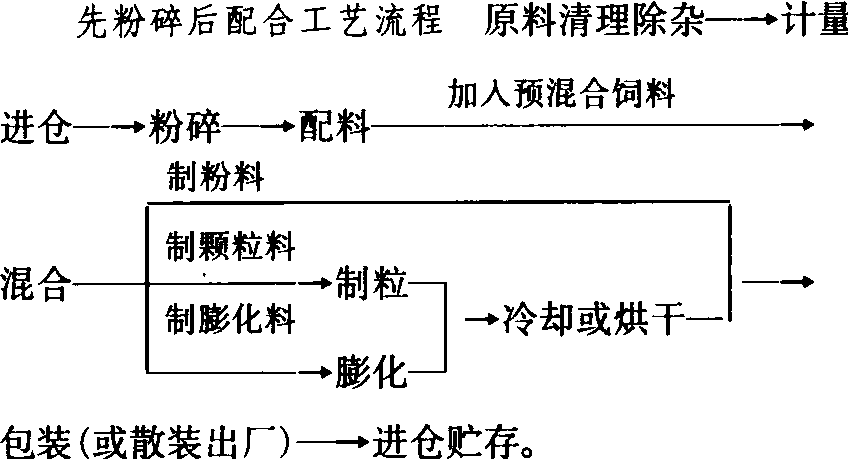 这种工艺流程可根据不同饲料选择合适的筛子,得到粒度均匀的粉料,配料误差小,且工作灵活。但粉碎后的各种粉料须先送入各自的配料仓,因而需要较多的配料仓,占地面积大,投资多,适用于大、中型配合饲料加工厂。 先配合后粉碎工艺流程 与前一种基本相同,只是将粉碎与配料二者的先后次序互换,粉碎后的物料直接进行混合,因而无需配料仓,厂房面积小,投资少。但配料误差较大,能源消耗较多,较适合于生产颗粒饲料,常用于小型饲料加工厂或配合饲料加工机组。如将需粉碎的各种物料先行配料粉碎,再与不需粉碎的物料配合,可减少能源消耗。 加工机械和设备 包括原料清理除杂用筛选设备和磁选装置;物料粉碎用饲料粉碎机和饼粕碎裂机;计量配料用饲料计量器;饲料混合机、饲料制粒机、膨化饲料机、饲料仓和配料仓;各种输送机和输送设备;冷却器或烘干设备;包装设备或散装饲料运输车等。各项设备可按不同的产品要求和工艺流程安装成配合饲料加工厂和预混合饲料加工厂,还可将几种机具装成一体,形成可移动的配合饲料加工机组,它具有结构紧凑、工艺流程简单、便于流动服务的优点,适合于小型饲料流动加工点使用。 |