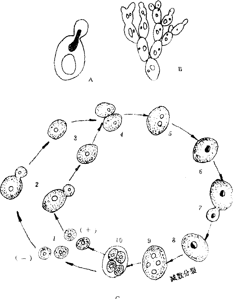| 释义 | 酵母菌jiaomujunSaccharomyces真菌门、子囊菌纲、酵母科中的酵母菌属。单细胞,圆形、椭圆形或卵形,也有腊肠形,少数种类可形成假菌丝。细胞宽1~5微米,长5~30微米。细胞壁的主要成分是甘露聚糖和葡聚糖。具真核、线粒体、内质网、液泡,贮藏物质为油滴和肝糖。有营养繁殖和有性生殖两种繁殖方式。营养繁殖为出芽生殖也叫芽殖。即在母细胞上产生1个小的突起,细胞核也分裂为二,其中1核进入小突起中,以后细胞壁逐渐紧缩,最后脱离母细胞,这个细胞称做芽孢子。每个芽孢子长大,即成1个新个体。在一端产生芽孢子,也可在两端产生,还可在多边产生。而且可以同时产生好几个芽孢子,有的芽孢子尚未脱离母体时又开始出芽,甚至有多个芽细胞相连,形成假菌丝;有性生殖时,和2个单倍体的营养细胞或2个子囊孢子融合成合子,合子再以出芽方式产生多个2倍体的细胞,此时每个细胞即为1个子囊,其内的二倍体核进行减数分裂,产生1~4个单倍体的子囊孢子。释放出来后,每个子囊孢子形成1个新个体。酵母菌具有多种酶系,既可进行无氧呼吸,又可进行有氧呼吸。能发酵多种糖类,发酵产物主要为乙醇和二氧化碳。分布很广,特别是在含糖多的水果、蔬菜上更多。著名的代表种是啤酒酵母,能发酵葡萄糖、蔗糖、麦芽糖、半乳糖和棉子糖,产生乙醇和二氧化碳。已被广泛用来酿制啤酒、酒精和其他饮料酒,并用来发面做馒头和面包。酵母菌自身的维生素和蛋白质含量高,有人分析推算,450公斤酵母的蛋白质含量相当于1头肉牛的含量。酵母还可药用和做饲料酵母,也可提取核酸、麦角醇、细胞色素C、凝血质、辅酶A、三磷酸腺苷等。也有些种类,可在果酱和蜂蜜、酱油等高渗溶液中生长发酵,造成产品变质。