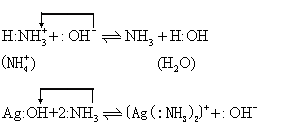 可见以H+为标准时,OH-比NH3强,因为OH-可从NH+4中取代出NH3,但是以Ag+为标准时,NH3就比OH-强,因为NH3可从AgOH中取代出OH-形成较稳定的 〔Ag(NH3)2〕+离子。这是广义酸碱反应中的普遍现象,也是酸碱电子论的不足之处。 |