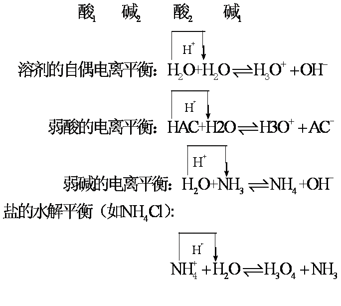 因此,有质子传递的平衡过程,如溶剂的自偶电离平衡、弱酸和弱碱的电离平衡以及盐类的水解平衡,全都可以纳入酸碱平衡的范畴。对这些酸碱平衡中的质子传递过程可分析如下: