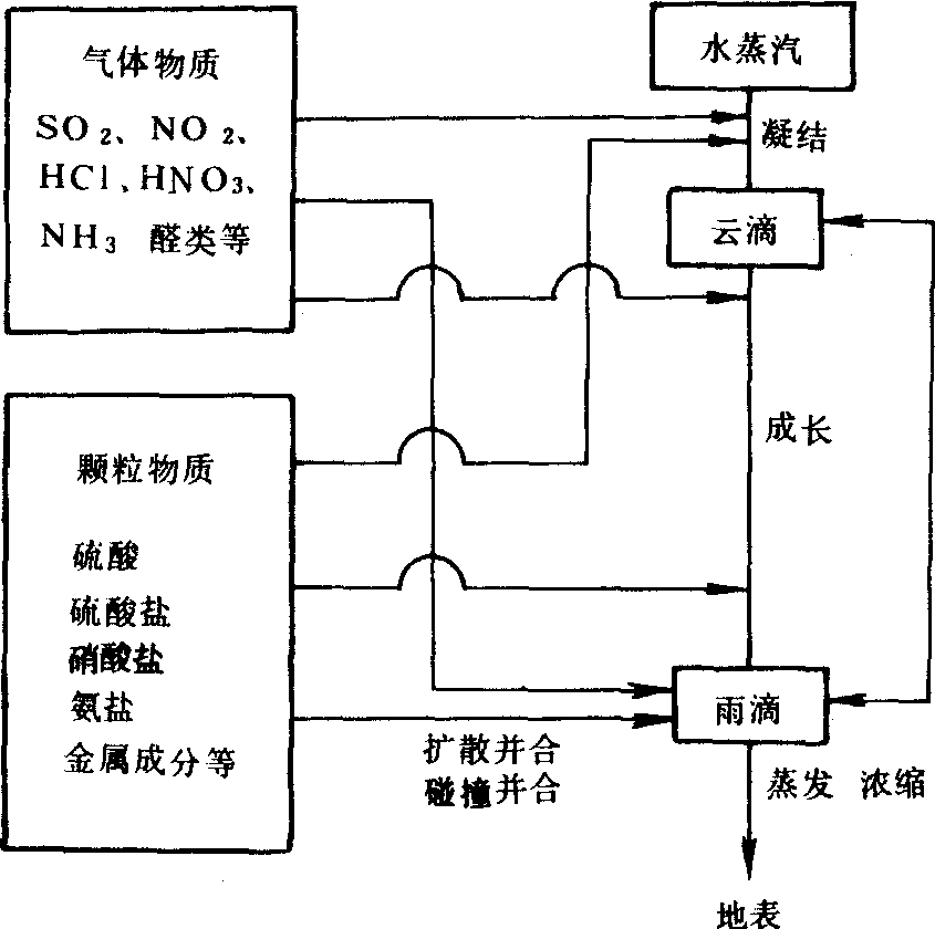 降水酸化的基本过程 酸雨是环境污染的一个突出问题, 它会导致河流和湖泊的水质变酸, 从而影响生态系统, 当水质酸化到pH值为5时,水中各种无脊椎动物会明显减少; pH值4时, 水中的鲑鱼类死亡。酸雨也可使土壤变酸,并降低土壤肥力, 恶化作物生长的环境。 20世纪50年代,北欧各国就对降水酸度开始监测,以后发展为全球性的环境保护研究。对中国各地的降水化学成分的分析表明, 酸雨污染现象已在不少地区出现。据1981~1983年观测,降水的pH低值多出现在南方地区, 重庆为3.32, 贵阳为3.70,武汉为3.73,广州和苏州为3.80。酸雨出现的频率也是南方高于北方,长江流域以南高达30%, 黄淮流域以北, 一般低于10%。世界许多国家均开展酸雨对生态系统影响的研究。据观测, 美国东部、加拿大东部和西欧广大地区,降水的年平均pH值为4.0~4.5。自1960年以来,北欧地区雨水的酸度, 平均每年约增加1%。1973~1978年间, 日本东京地区降水的平均pH值为4.2。1980年3月在挪威召开的国际酸雨会议指出,硫和其它污染物的大气漂移, 已使北美和欧洲一些中和能力很低的河流严重酸化。 酸雨acid rainpH值小于5.6的雨、雪或其他的酸性沉降物。纯净的雨水呈弱酸性,当排入大气中的二氧化硫、氮的氧化物浓度增高时,使雨水的酸度增大,形成酸雨。这是一个复杂的大气化学和大气物理现象,是大气受污染的表现,对人类健康和环境有很大的危害。 酸雨见“环境科学”中的“酸雨”。 酸雨pH值小于5.6的雨雪或其他形式的大气降水。为大气受污染的一种表现,危害极大。最早引起注意的是酸性降雨,故名。现多称为酸性降水。酸的成分主要是人为排放的SO2和NOx转化成的硫酸和硝酸。 酸雨acid rain又称酸性降雨、酸沉降、环境酸化。pH值小于5.6的大气降水。是大气污染的表现形式之一。酸雨的形成是由于空气中过量的二氧化硫和氮氧化物发生光化学反应后最终生成硫酸和硝酸,溶于水汽中,从而使雨水酸度增高。其中硫酸对雨水酸度的影响约占70%,硝酸约占30%。大气颗粒中的铁、锰等元素是成酸的催化剂。酸雨可使土壤、湖泊、河流酸化。当水的pH值降到5以下时,会严重影响鱼的繁殖和发育。酸雨也能抑制土壤中有机物的分解和氮的固定,淋洗土壤中钙、镁、钾等营养元素,使土壤贫瘠化。酸雨还会伤害新生的叶、芽和腐蚀建筑物等。饮用酸化了的水,对人畜健康有害。酸雨是世界性污染问题。中国由于二氧化硫排放量较大,受酸雨危害的地区较多,尤以西南地区的贵阳、重庆为严重。 酸雨Acid Rain含有硫酸和硝酸、超过正常酸度的降水(包括雨、雪、冰雹、霰)。浓度通常用pH值来测定。数值越小,酸性浓度越高。成因一般是工厂、电厂、汽车等燃烧煤、石油或瓦斯等释放出的氧化硫和氧化氮与空气中的水蒸气结合,产生硫酸和硝酸后,随雨、雪或其他形式的降水降落到地面而形成。危害很大,摧残林木,使土壤酸化,影响人体健康和动植物生长,还会腐蚀建筑物等设施的外表。在加拿大,受酸雨侵害最严重的地区为东南部。加拿大的林业总产值高达200亿加元,所以,治理酸雨对林业的危害、防止林业减产对加拿大来说至关重要。防止酸雨的措施包括使用低硫或无硫燃料、采取气态降硫工艺、节能或采用替代能源。20世纪70年代和80年代初,由于政府采取相应的措施,二氧化硫排放量大大降低。近年来,加拿大政府还和邻国签订一系列共同防止酸雨、降低污染的协约。 酸雨通常指含大量二氧化硫的烟气在大气中逐渐氧化成酸性氧化物后,再与大气中的水汽结合成雾状的硫酸,并随雨雪一起降落下来,包括液态的酸雨、气态的酸雾、固态的酸雪和酸雹。它是大气遭受严重污染的一种表现。酸雨中还可能含有硝酸、盐酸等酸性物质,成分复杂,其PH值小于5.6。酸雨形成的过程,一般是从二氧化硫和氮的氧化物进入大气开始。大气中的酸性物质,少部分来自大自然,如火山喷发、动植物腐败,海水蒸发等散逸出的含有酸性物质的气体; 大部分来自人类活动,如燃烧煤和石油等化学燃料的汽车排出的尾气、某些工业产生的烟气、排出的废气。随着近代工业的发展和生活耗能的不断增加,全世界大气中的污染物质已超过6亿吨。酸雨对湖泊、森林、农作物、建筑物、鱼类及各种生物都是有害的。某危害是使土壤、河湖酸化,腐蚀建筑物及其他人类的设施的外表,影响动植物的繁殖和人体健康。酸雨是由瑞典气象学家在20世纪50年代首先发现的。1956年酸雨中心出现在英格兰的东南部,法国北部和波兰。3年后,中心地带的酸雨变得更酸,其影响范围也在扩大。到60年代中期,美国也出现了酸雨。70代在美国东北部、斯堪的纳亚半岛、日本、丹麦和加拿大等国的大部分地区均出现酸雨,其PH值为4—4.2之间。之后,拉丁美洲、东南亚、中东和远东地区随着发展中国家工业的兴起,也形成新的酸雨中心。1979年3月,在中国贵州省的松桃县和湖南省的长沙等地也发现酸雨,PH值为4.8。解决酸雨危害的根本途径,在于彻底消除大气污染。 酸雨湖南已成为中国最严重的酸雨区之一。大气降水PH值小于5.6的等值面积不断扩大,降水酸性继续升高。酸雨频率逐年增加,进入九十年代后居高不下。最严重地区以长沙为中心,北起岳阳南至郴州的湘江流域和以洪江为代表的湘西南广大地区。湖南酸雨属典型的硫酸型,各地燃煤排放的二氧化硫是主