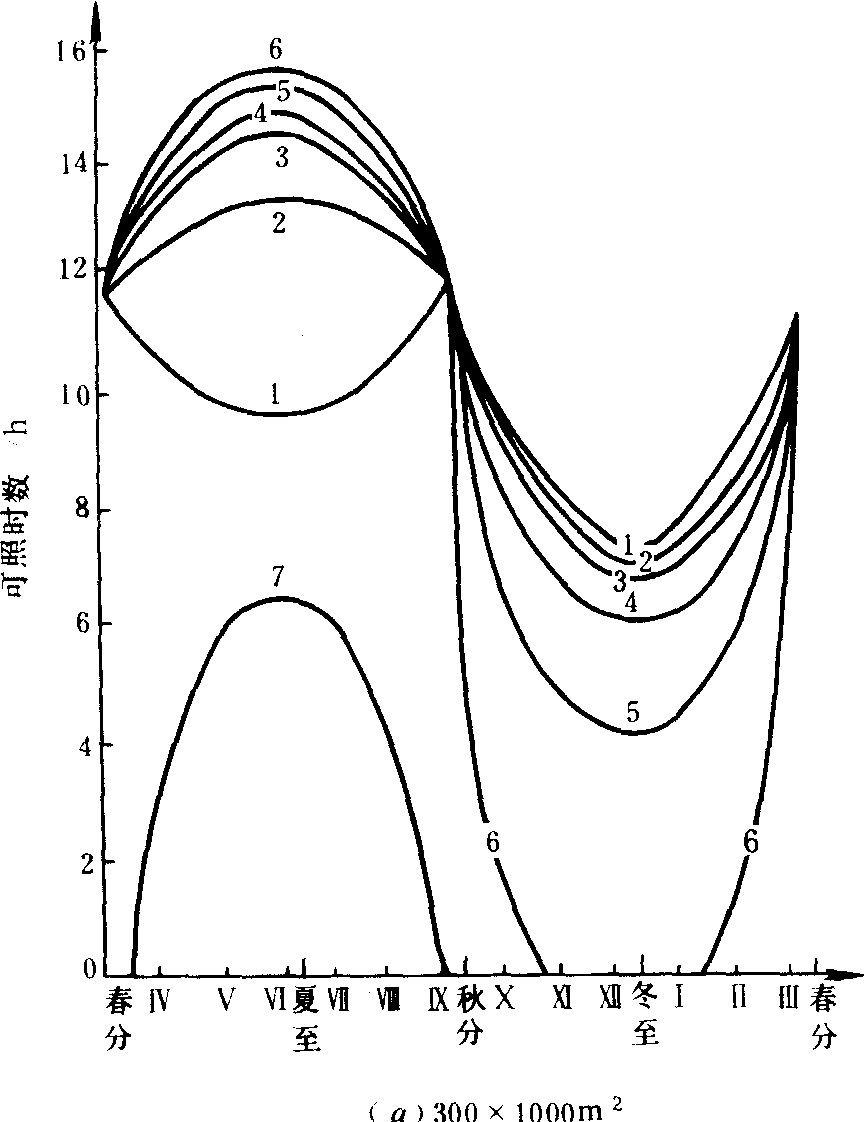 (a)1、2、3、4、5、6、7分别距北林墙为25、50、100、150、250米处的日照变化