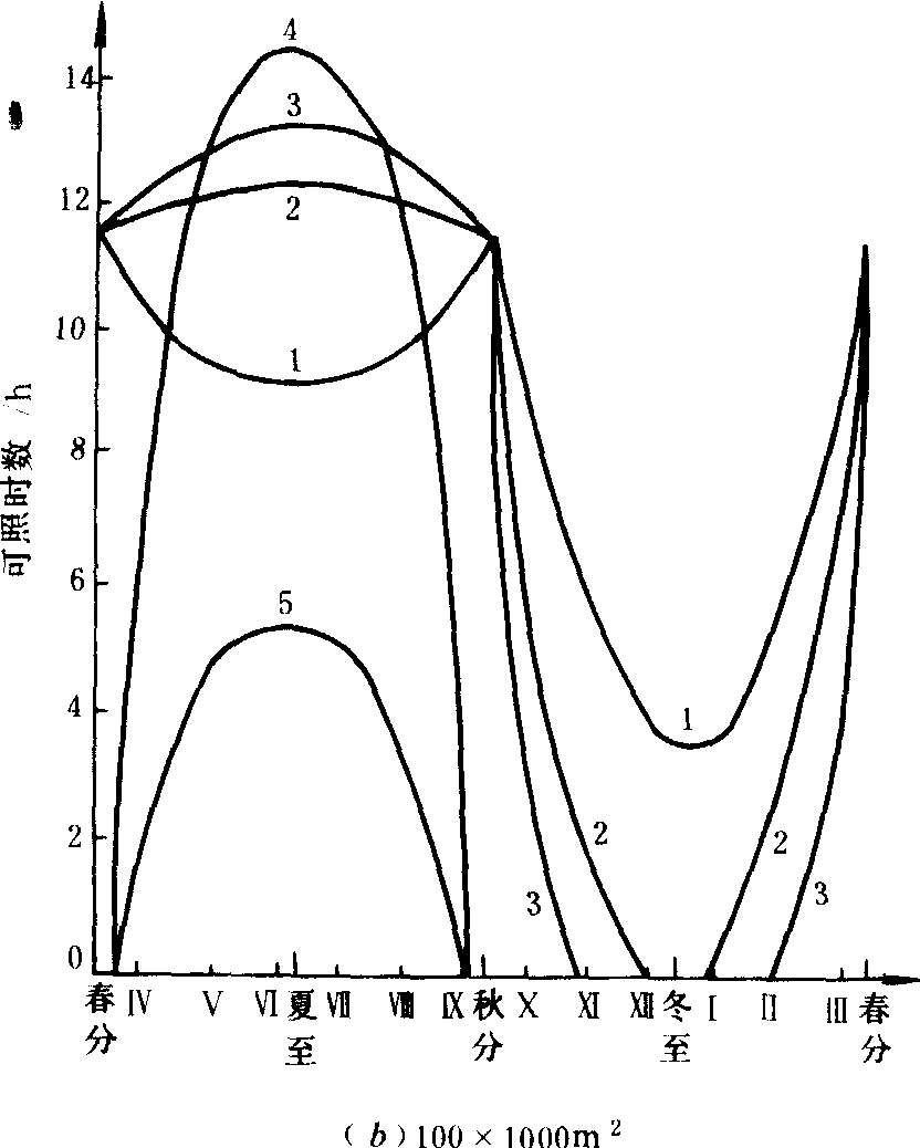 (b)1、2、3、4、5分别距北林墙为10、25、50、75、90米处的日照变化