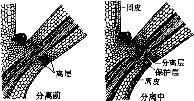 蔬菜器官脱落都发生在离层区。离层区由几层较小、细胞质较浓稠、木质和细胞壁物质沉积较少的细胞组成(见图)。离层区组织分化形成缓慢,多年生植物有时可长达数年。脱落发生在离层区中分离层,开始是分离层分泌水解细胞纤维素和果胶的水解酶,这时呼吸作用加强,并伴随核糖核酸(RNA)和蛋白质合成同步上升,果胶分解酶——多聚半乳糖醛酸酶增多,果胶甲酯酶活性下降。在几小时内细胞壁肿起,细胞质丧失边膜,开始溃解,纤维素的水解导致细胞最后的分离。由靠近分离层的细胞在脱落前分裂形成保护层,或直接在紧靠分离层的细胞中沉积木栓和木质,形成保护层。脱落需能量和氧。温度高低决定脱落速度。碳水化合物和矿物质缺乏会促进脱落。植物内源激素消长平衡明显影响脱落,脱落启动时内源脱落酸(ABA)迅速上升,外源ABA可启动脱落,而乙烯也有促进脱落的作用。生长素、赤霉素和细胞分裂素是抑制衰老和脱落的激素,当器官衰老脱落时其含量都明显下降。但在离层区已开始活动情况下低剂量吲哚乙酸(IAA),在接近离层的一端处理,反而促进脱落;当乙烯存在时,赤霉素(GA)会促进水解酶的合成而成为促进脱落的因素。因而上述激素对脱落的控制,并不依赖单个激素在某个器官中存在,而是取决于它们在离层与其他器官间的平衡以及脱落酸与吲哚乙酸、赤霉素、细胞分裂素(cytokinin)比率的高低。
