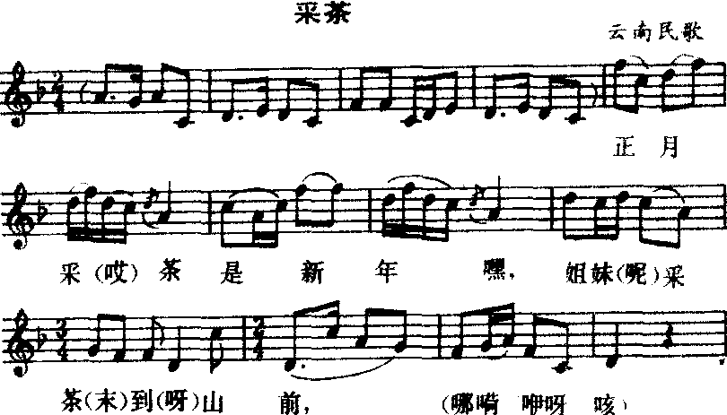 | 释义 | 采茶云南花灯。花灯,是我国西南地区的歌舞形式。流行于云南、贵州及四川等地。那翩翩舞姿,细腻婉转,配合以优美而淳朴动听的音乐,着实令人神往。花灯的音乐,多来自明清小曲及本地民歌。采茶,实际上可称是一首道地的云南民歌,旋律为五声徵调,节奏灵巧而富于变化。旋律中从低羽音上行小7度到徵音的进行,秀丽舒展,颇有韵味。整个音乐,描述姐妹们在田间采茶,亲密无间,无拘无束,给人以上分欢悦而亲切的印象。