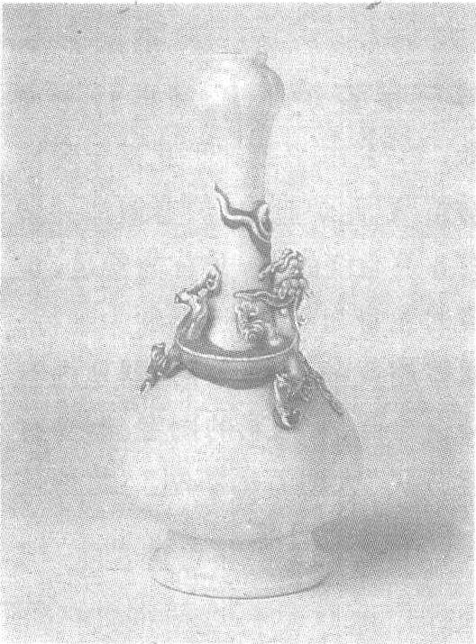 | 释义 | 釉里红凸雕蟠螭纹蒜头瓷瓶明嘉靖。高29.8厘米,口径3厘米。北京故宫博物院藏。瓶口呈六瓣蒜头式,长颈,垂腹,高圈足。此为嘉靖时期流行的瓶式。瓶通体施白釉,釉色洁白,细腻肥厚。肩颈处堆塑绕瓶盘旋的蟠螭纹。蟠螭纹以釉里红(也有人认为是红釉)装饰,釉层较薄,呈色鲜艳。文献记载嘉靖时期无红釉,仅以矾红装饰。此件器物的珍藏证明当时烧制釉里红或红釉器,从而否定了嘉靖时期无红釉器的文献记载。此釉里红蒜头瓷瓶是研究这一时期瓷器生产的珍贵资料。