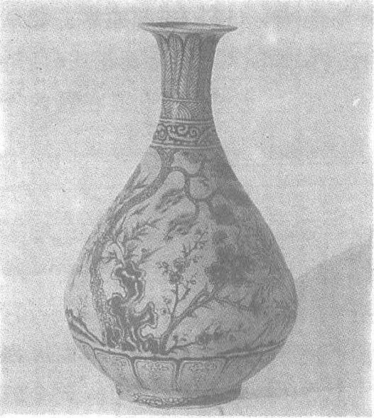 | 释义 | 釉里红松竹梅纹玉壶春瓷瓶元。高32.3厘米,口径8.8厘米。北京故宫博物院藏。在元代,玉壶春瓶是深受人们喜爱的一种瓶式。其形制基本沿袭宋代,但缩短了颈部,腹部增大,圈足高度降低,使瓶体造型更为丰满、稳健。此瓶为典型的元代形制。口沿外侈、细颈、硕腹、矮圈足。瓶颈绘蕉叶纹一周,其下为海水纹和卷草纹。腹部为主题纹饰:绘松、竹、梅(松竹梅被誉为“岁寒三友”,宋以后常用作瓷器的装饰画)。近底处为变形莲瓣一周。全器纹饰密布有序,釉里红呈色纯正,是元代釉里红瓷器的优秀作品。北京中国历史博物馆藏有一件形制、边饰类似,但主题纹饰为缠枝菊的釉里红玉壶春瓶。釉里红见“釉里红地白龙纹瓷盖罐”条目。