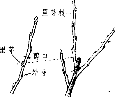 | 释义 | 里芽外蹬扩大骨干延长枝分枝角度的一种果树修剪方法。通常剪口芽抽生枝多较直立而旺盛,分枝角小;而其下的芽所抽枝则较开张。利用这一特点,冬剪时,剪口第二芽留向外芽,而剪口芽为里芽。剪口芽所发的强枝,迫使第二芽向外以较大的角度生长。第二年冬剪时将剪口芽所生枝连带一小段母枝短截,留第二枝作为延长枝,达到使生长势减弱,角度加大目的。此法因除去里芽所抽枝,使外芽抽生枝向外扩展,果农称为里芽外蹬。用于树势旺,成枝力高的树种和品种。