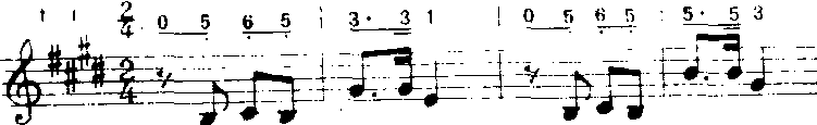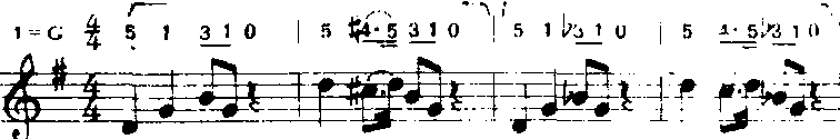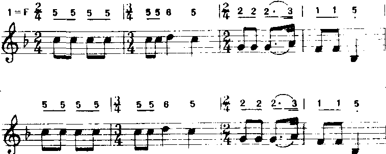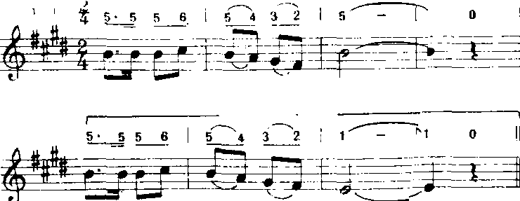 以上第二乐节(第三、四小节)是第一乐节(第一、二小节)的节奏重复。在音调上,第二乐节降低了第三级音,而使音乐从大调性变为小调性,还将第一乐节中升高半音的第四级音还原,而减弱了其对原音的倾向性,使情绪由热烈变为柔和而得到了发展。又如《天地之间的歌》(乔羽词魏群曲):
