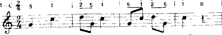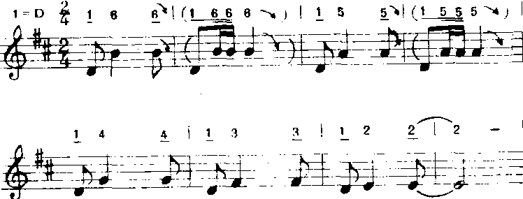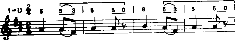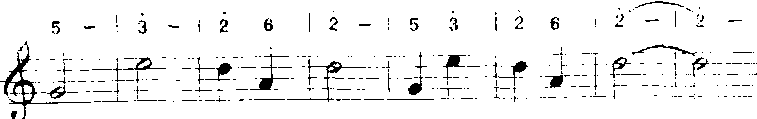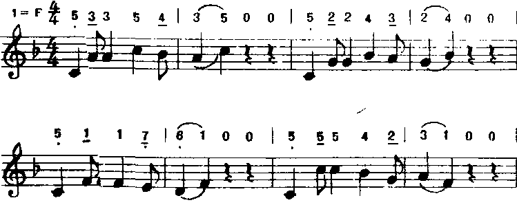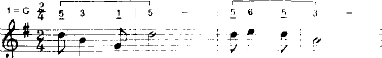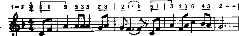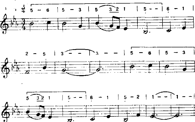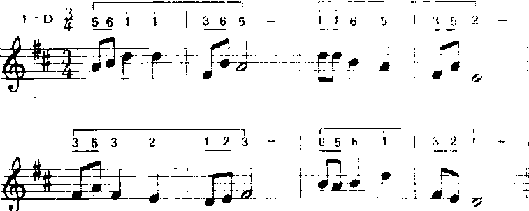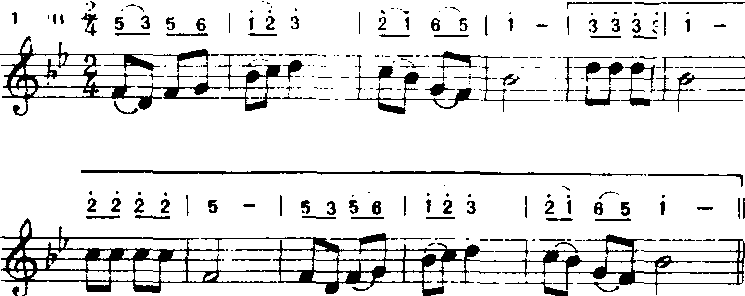 以上方法用“do”音为支撑点,音程从六度五度、四度、三度逐渐缩减为二度。常用于歌曲中间。 ❻补充和扩充重复。补充和扩充前面的歌词,曲调重复或变化重复都有强调某些词意和加强结束感的功能。a)补充重复:曲调落到主音后再重复叫补充。多用于由尾和段尾,有时也用于句尾。如《小红花》(金波词疾曲):