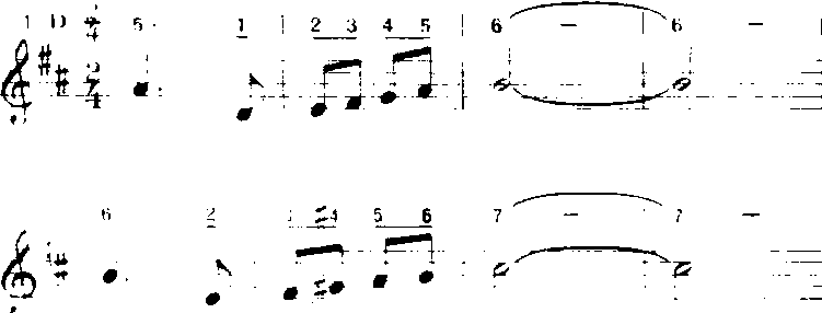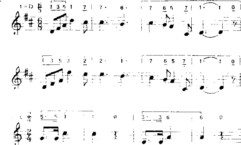 以上是严格向上大二度移位。(b)自由移位重复。移高或移低后的曲调的音程关系与原曲调的音程关系不完全相同。如《谁对谁不对》(中央电视台儿童系列片《谁对谁不对》主题歌) (李众词杨春华曲):