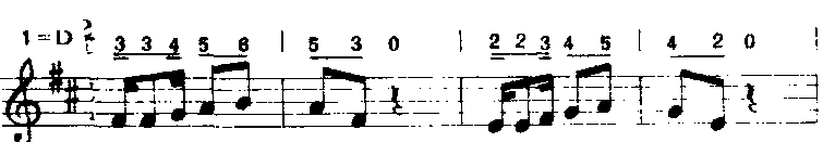 移位重复是儿童作曲中常用的发展手法。在儿童歌曲中特别是自由移位重复用得更多,严格移位用得较少。连续移位常用在情绪不断发展的地方或高潮区,使情绪推向新的高度而形成歌曲的高潮。 ❹节奏伸缩重复。基本上不改变音乐主题或前面曲调的音调,而改变其节奏。这样不仅可以加深对音调的印象,还能增强节奏的对比和深化而又统一的艺术表现力。节奏变化有两种方法:一是伸展法(也称增时法),另一是缩短法(也称减时法伸缩时可以是整个乐句,也可以是其中一部分。有时在乐句之间,有时则在不同乐段的结尾。如《好同桌》(赵桂嫏、伊克昭词杨春华曲)音乐主题为: