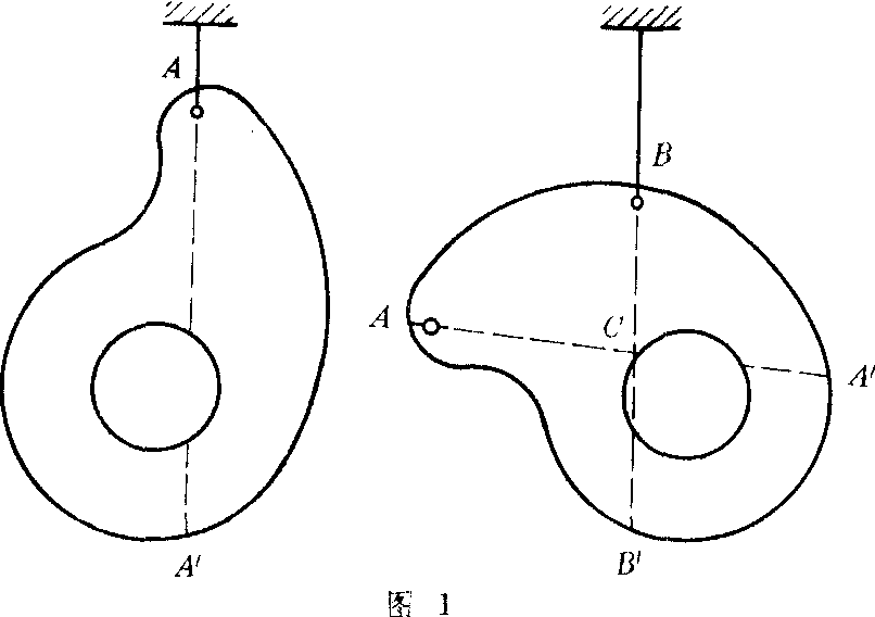 表中V、A、L分别为物体的体积、面积、长度;dV、dA、dL分别为微块的体积、面积、长度。 ❷利用物体的对称性求重心。凡均质分布的具有对称面、对称轴或对称中心的形体,其重心必在这个对称面、对称轴或对称中心上。 ❸悬挂法。如图1,为一质量不均匀的薄板,先在A处用细绳系住,把板悬挂起来,静止后过A点画一铅垂线AA′;再另选一点B,仍用细绳系住把板悬挂起来,静止后过B点再画一铅垂线BB′。这两条直线的交点C就是薄板的重心。这种方法只能求出薄板重心的两个坐标。 ❹称重法。如图2,将连杆的一端(大头)B放在台秤上,示数为NB,另一端(小头)A放在水平面或刀口上,使中心线AB处于水平位置。设连杆重为G,连杆重心C必在中心线AB上,小头孔心距重力G的作用线为xC,由力距平衡可得xC=NB/Gl。此法只能求出重心的一个坐标。重心和质心是两个截然不同的物理概念。❶质心是与质点系质量分布密切相关的几何点,质心的位置是以质量为权重的质点系中所有质点的平均位置。重心是地球重力作用的作用点,它不仅与质点系质量分布有关,而且和地球的作用有关,没有地球重力作用,重心不存在,但质心不变。 ❷只有当物体受到重力作用,物体本身线度与它到地心距离相比小得多,物体各点所受重力加速度可认为一样,即可把物体上各处所受重力看成平行力时,重心与质心重合。